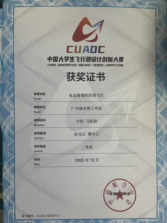 10月8日至13日,2025中國大學(xué)生飛行器設(shè)計創(chuàng)新大賽(CUADC)全國總決賽在浙江莫干山機場舉行。廣州城市理工學(xué)院機械工程學(xué)院/機器人工程學(xué)院“無疆航模隊”憑借扎實的技術(shù)積累、日夜兼程的鉆研與賽場上的出色發(fā)揮,從全國150余所高校的競爭中脫穎而出,斬獲全國電動滑翔機控制飛行項目二等獎、限時載運飛行項目三等獎兩項殊榮。