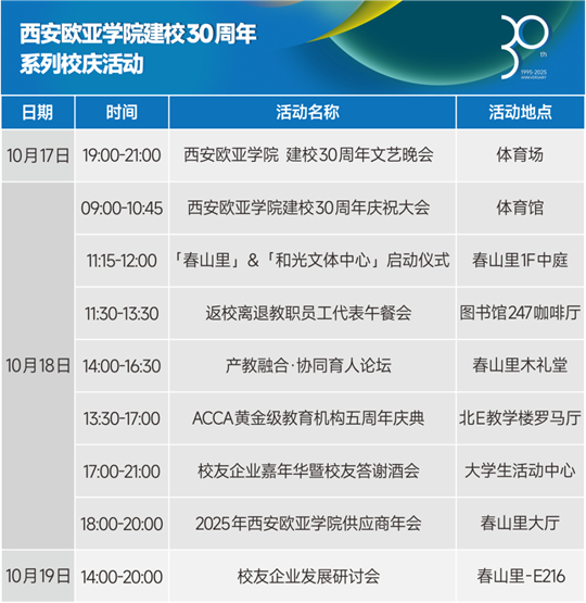 此外,西安歐亞學院建校30周年文藝晚會將率先點亮校慶的第一束光;返校離退教職員工代表午餐會向躬耕教育的教師致敬;供應商年會則彰顯與合作伙伴攜手共進、構建良性生態(tài)的誠意。