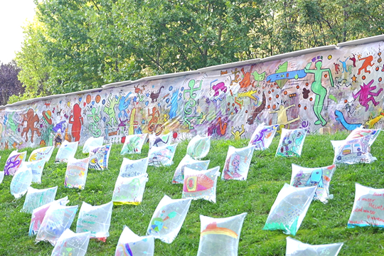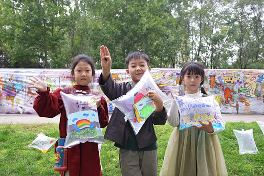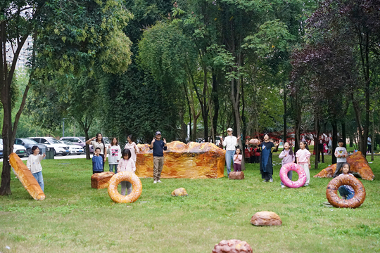 其中,校外參展單位的作品呈現(xiàn)了對兒童藝術(shù)教育的深刻理解和多元探索。大家集體共創(chuàng)的涂鴉長廊,以自由揮灑的集體創(chuàng)作,開啟了一場關(guān)于色彩與想象的狂歡。不知藝術(shù)學(xué)院帶來的“光之穹頂”“Hi”“穿林之所”3件作品,分別以輕盈材質(zhì)構(gòu)筑冥想空間,以生動手勢連接人與自然,以廊道引導(dǎo)沉浸體驗(yàn),啟發(fā)觀者多維度探索藝術(shù)與場域的關(guān)系。唐門藝術(shù)12名孩子創(chuàng)作的“破繭之屋”作品,在草坪上搭建起一座60多平米的兼具美感與溫度的“破繭蛻變之所”,讓孩童對自然的奇思妙想有了具象載體。LE8 ART和斑斕繪本美術(shù)共同呈現(xiàn)的“甜蜜的草坪”作品充分激發(fā)味蕾,孩子們親手繪制的“金黃面包”錯落點(diǎn)綴于草坪,創(chuàng)造出獨(dú)特的通感體驗(yàn)。彩色樹兒童美育工作室創(chuàng)作的“呼吸 水源 循環(huán)”作品,讓孩子們能夠更加直觀地理解生態(tài)循環(huán)的奧秘。