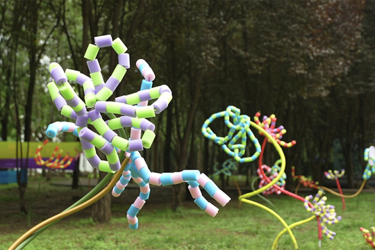 熟悉西安歐亞學(xué)院校園的人都知道,北E教學(xué)樓附近經(jīng)常會冒出一些新鮮好玩的藝術(shù)裝置,這里是人文教育學(xué)院師生們創(chuàng)作的“天堂”。在歐亞30周年校慶之際,一粒名為“自然·童趣·共生”的靈感種子,又在這片花園沃土中落地生根,燦然綻放。