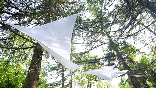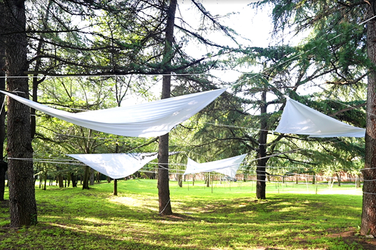 以白布與尼龍繩在林木間構(gòu)筑出一座漂浮的半透明穹頂,通過材質(zhì)的輕盈特性與自然元素形成深度對話,創(chuàng)造出可供冥想、舞動的開放場域。