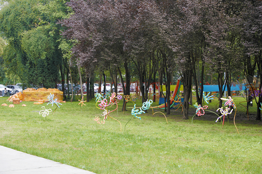 本屆大地藝術(shù)節(jié)上,人文教育學(xué)院與艾多思兒童美術(shù)館、不知藝術(shù)學(xué)院、大象米羅少兒美術(shù)體驗(yàn)中心、寓言兒童美術(shù)館、LE8 ART、藍(lán)色星空少兒美術(shù)館、星星島兒童美術(shù)館、西安思麥克教育科技有限公司、西安向陽花美術(shù)館、繪出心靈藝術(shù)工作室、斑斕繪本美術(shù)、彩色樹兒童美育工作室、唐門藝術(shù)、大風(fēng)驛吉老師美育、寓見兒童美術(shù)館(排名不分先后)等15家西安地區(qū)極具代表性的美育單位合作,通過10余天“大地藝術(shù)研學(xué)營”的策劃設(shè)計與現(xiàn)場創(chuàng)作,打造了17組充滿童趣又兼具教育意義與藝術(shù)價值的公共藝術(shù)作品。