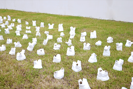 用30000根工業(yè)扎帶編織“爬樹巨人”與“飛翔小狗”,將標(biāo)準(zhǔn)化工業(yè)材料轉(zhuǎn)化為有機(jī)生命形態(tài),探討工業(yè)文明與自然的共生關(guān)系。