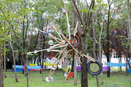 這一次,教學(xué)樓周圍的草坪、樹林、圍墻,都成為師生和孩子們創(chuàng)作的畫布,大家或手繪涂鴉墻,或用棉繩、輪胎、木條編織有趣的裝置,或利用青石板、苔蘚、陶泥將作品融入自然之中……10月18日,西安歐亞學(xué)院兒童大地藝術(shù)節(jié)在北E教學(xué)樓北側(cè)正式啟幕,籌備許久的艾多思兒童美術(shù)館也面向公眾正式開放。
