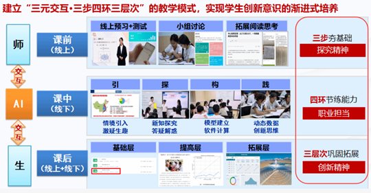 在十五年的教學實踐中,她主導的“理實遞進式”教學資源體系、“一引擎四聯(lián)動”數(shù)智化教學手段和“三元交互·三步四環(huán)三層次”教學模式,構(gòu)建起數(shù)學教育的立體化生態(tài)。