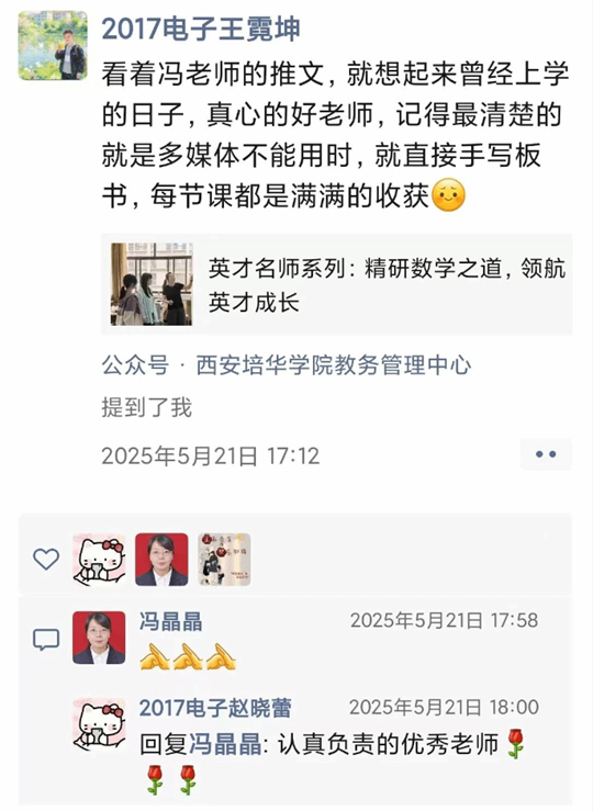 針對學習困難的學生,馮晶晶建立了專門的幫扶檔案,定期與學生談心交流,分享高效學習方法,還鼓勵他們嘗試成為“小老師”。當學生通過自己的努力向同伴講清知識點時,那份被點燃的自信與成就感,成為他們主動成長的強大動力。這份用心,讓畢業(yè)多年的學生仍念念不忘——2017級電子專業(yè)的王霓坤在朋友圈轉(zhuǎn)發(fā)馮晶晶的推文時寫道:“真心的好老師,記得最清楚的就是手寫板書,每節(jié)課都是滿滿的收獲!