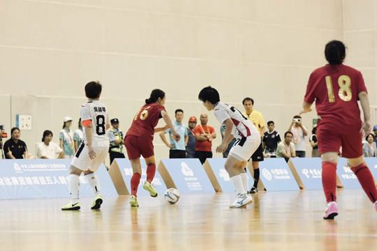 李萌在十五運會群眾比賽足球項目五人制女子組頒獎現(xiàn)場