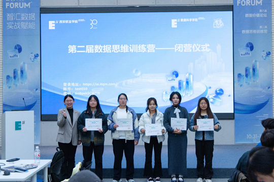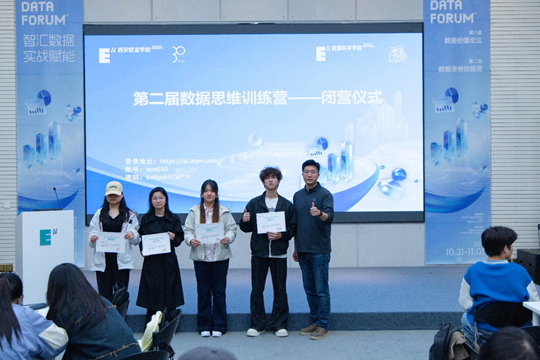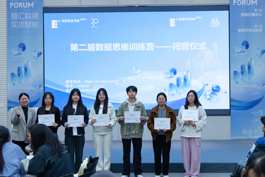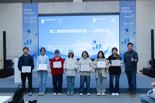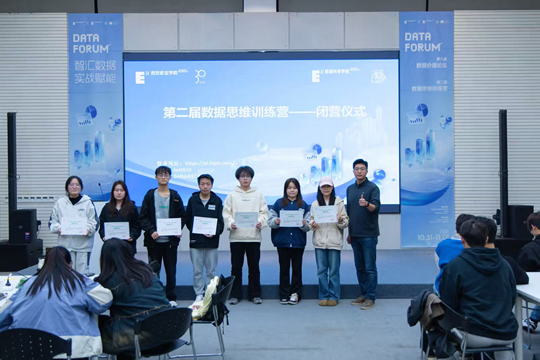最后,數(shù)據(jù)科學(xué)學(xué)院院長助理孟妍與教師史博文頒發(fā)結(jié)業(yè)證書,鼓勵(lì)大家將訓(xùn)練營所學(xué)轉(zhuǎn)化為長期競爭力,在數(shù)據(jù)領(lǐng)域持續(xù)深耕。至此,第二屆數(shù)據(jù)思維訓(xùn)練營閉營儀式圓滿結(jié)束,而學(xué)生們的實(shí)戰(zhàn)成長之路,才剛剛啟航。