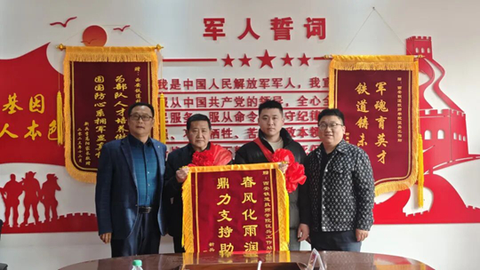 家長代表懷著感恩之心,將一面繡有“春風化雨潤學子,鼎力支持助從軍”的錦旗贈送給學校。錦旗上的鎏金字跡,在燈光下格外耀眼,它不僅是家長對學校的致謝,更是對學!昂裰矅澜逃、助力學子參軍”理念的高度認可,讓整場儀式充滿了家校同心、共筑國防的溫暖力量。