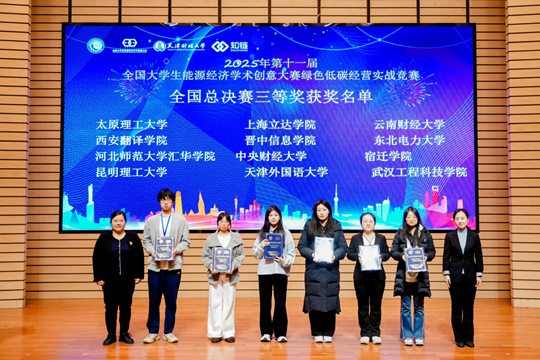 12月6日,第十一屆全國大學生能源經濟學術創(chuàng)意大賽綠色低碳經營實戰(zhàn)競賽全國總決賽在天津財經大學落下帷幕。晉中信息學院由王怡、李維佳兩位老師指導,裴靜瑤、張夢、王依婷三名同學組成的參賽團隊,憑借扎實的專業(yè)功底和出色的實戰(zhàn)決策能力,在全國78支本科組參賽隊伍中脫穎而出,最終斬獲全國三等獎,為學校贏得榮譽。