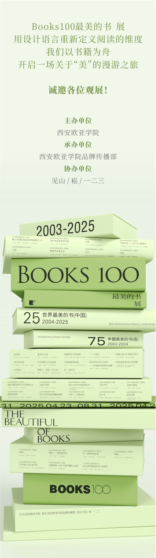 審美是持續(xù)的過程,它需要在美的場域中浸泡而來。值此第三十個世界讀書日,西安歐亞學(xué)院特此舉辦「books100 最美的書 展」,集中展出中國在2004-2025年間斬獲"世界最美的書"殊榮的25本獲獎大作,并精選75本"中國最美的書",共呈現(xiàn)100部中國書籍設(shè)計高水準(zhǔn)精品佳作。