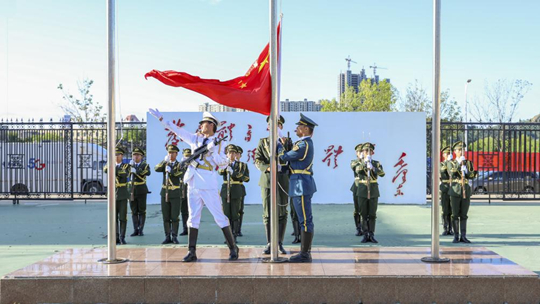 上午7時,儀式正式啟動。第一項為升國旗、奏唱國歌。全體師生肅立,國旗護(hù)衛(wèi)隊邁著整齊有力的步伐出旗。在激昂的國歌聲中,五星紅旗冉冉升起,全體人員行注目禮,目光追隨著國旗直至頂端,現(xiàn)場氛圍莊嚴(yán)而肅穆。