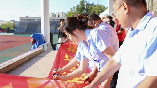 儀式第四項為簽字環(huán)節(jié)。工作人員將簽字橫幅移至主席臺前,學(xué)校領(lǐng)導(dǎo)、教師代表與學(xué)生代表依次上臺,在橫幅上鄭重簽下名字,以實際行動踐行愛國承諾。