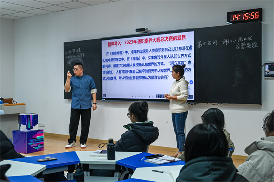 雙師授課,突破傳統(tǒng)學(xué)科界限,訓(xùn)練融合思維。學(xué)校遠(yuǎn)景學(xué)院、通識(shí)教學(xué)部、創(chuàng)意寫作學(xué)院等7個(gè)教學(xué)單位,以通識(shí)課程為試驗(yàn)田,結(jié)合通識(shí)教師的多學(xué)科專業(yè)背景,進(jìn)行“雙師、多師同堂協(xié)同授課”課堂改革,由2位或多位教師共同協(xié)作,將“設(shè)疑導(dǎo)入法、情景啟動(dòng)法、發(fā)散思維訓(xùn)練法、互動(dòng)教學(xué)法”運(yùn)用于教學(xué),形成集講評、論辯、討論于一體的跨學(xué)科教學(xué)模式。