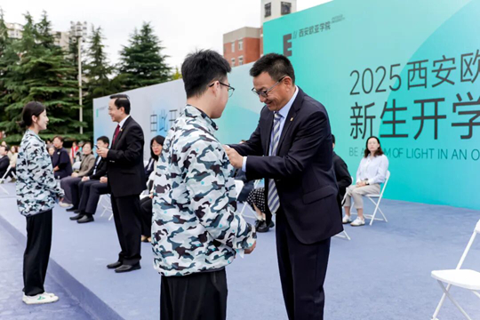 西安歐亞學(xué)院創(chuàng)辦人、董事長(zhǎng)胡建波教授,西安歐亞學(xué)院黨委書記趙國(guó)華教授共同為新生佩戴;眨C發(fā)30周年限定版學(xué)生證。