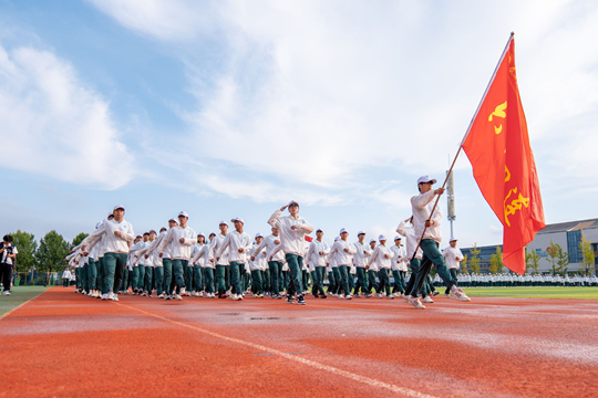 標(biāo)兵就位后,軍訓(xùn)副團(tuán)長張卓率隊(duì)迎接團(tuán)旗,全體參訓(xùn)師生肅立致敬。