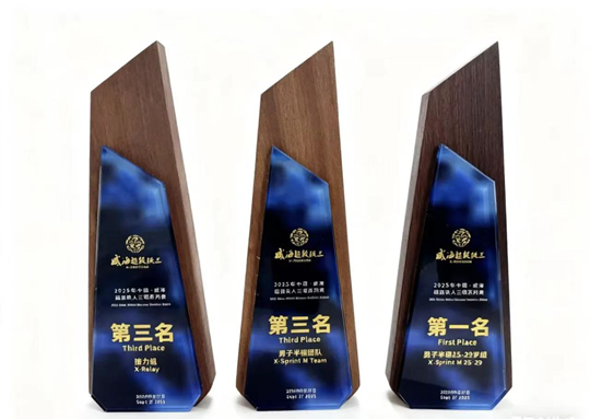 左1全程接力組獎(jiǎng)杯,中間半程團(tuán)體獎(jiǎng)杯,右1為男子半程個(gè)人獎(jiǎng)杯