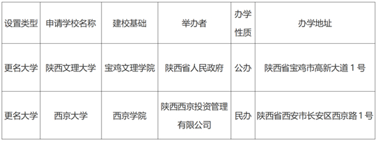 根據(jù)《中華人民共和國高等教育法》《普通高等學(xué)校設(shè)置暫行條例》《普通本科學(xué)校設(shè)置暫行規(guī)定》等有關(guān)規(guī)定,經(jīng)陜西省高等學(xué)校設(shè)置評議委員會考察和評議,現(xiàn)對擬向教育部申報的“寶雞文理學(xué)院更名陜西文理大學(xué)”“西京學(xué)院更名西京大學(xué)”事項予以公示,接受社會監(jiān)督。