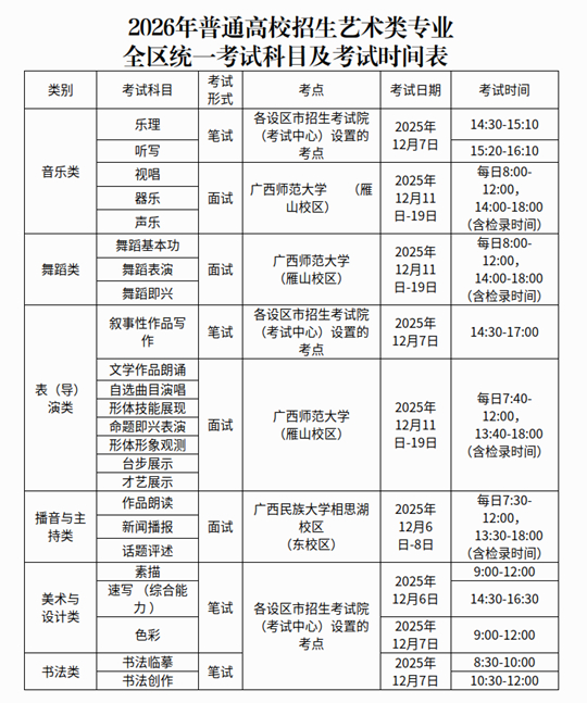 2026年普通高校招生藝術(shù)類專業(yè)全區(qū)統(tǒng)一考試(以下簡(jiǎn)稱全區(qū)藝術(shù)統(tǒng)考),設(shè)置音樂(lè)類、舞蹈類、表(導(dǎo))演類、播音與主持類、美術(shù)與設(shè)計(jì)類、書(shū)法類、戲曲類等7個(gè)考試類別,其中戲曲類采用省際聯(lián)考由相應(yīng)專業(yè)(劇種)的組考院校負(fù)責(zé)組織(另文公布),其余考試類別由我院組織,具體安排如下表:
