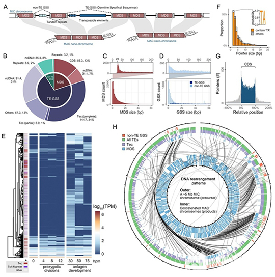 在本研究中,課題組成員進一步通過PacBio高通量測序技術(shù)完成了對該海洋纖毛蟲生殖系基因組的高質(zhì)量測序和組裝,發(fā)現(xiàn)其中超過80%的序列為轉(zhuǎn)座子等生殖系特異性序列,并且這些片段大多插在基因編碼區(qū),因此必須在體細胞核發(fā)育過程中被精確刪除。