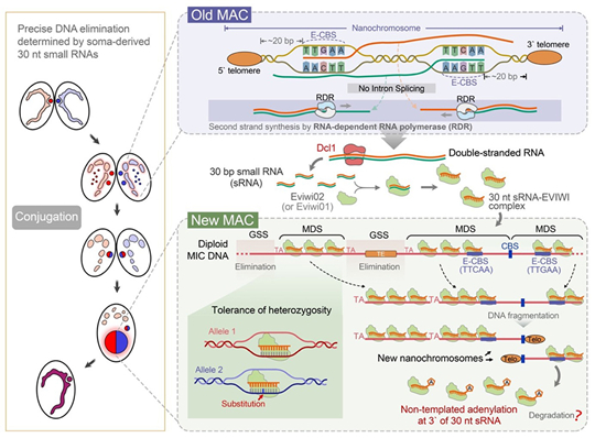 elimination in Euplotes vannus”(扇形游仆蟲中母本體細胞系來源的30nt小RNA與染色體斷裂偶聯(lián)并精確靶向非轉(zhuǎn)座子DNA序列使其保留在子代體細胞核中)的研究成果。該研究以海洋纖毛蟲為模式材料,鑒定了一類在有性生殖時期特異性合成的小RNA,系統(tǒng)闡明了這類小RNA的來源、加工機制及其在維持基因組穩(wěn)定性中的關(guān)鍵作用,為理解真核生物中小RNA介導的跨代遺傳信息傳遞提供了全新視角。