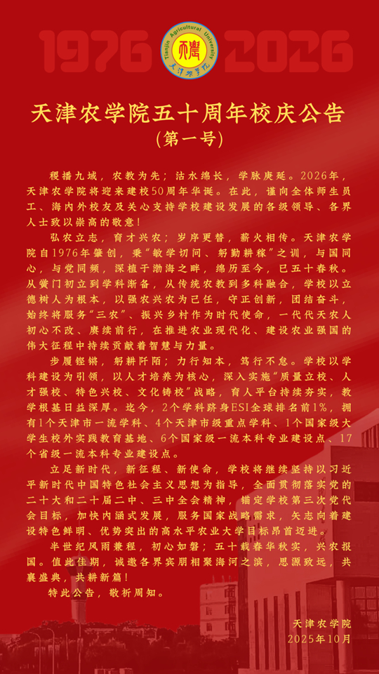 天津農(nóng)學(xué)院五十周年校慶公告(第一號(hào))
