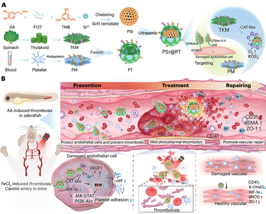針對以上問題,研究團隊成功研發(fā)了一種以病理微環(huán)境驅(qū)動為核心的納米馬達系統(tǒng)(PSr@PT NPs),該系統(tǒng)的核心由摻鍶離子(Sr2+)的介孔聚多巴胺納米顆粒(PSr NPs)構(gòu)成,它既作為納米馬達的主體,也是氧化應激觸發(fā)下釋放Sr2+的儲存庫,同時還能清除活性氧。為了實現(xiàn)雙重靶向推進,在PSr NPs表面整合一層由血小板膜(PM)和菠菜來源類囊體膜(TKM)組成的雜化膜;谘“迥さ陌邢蛐耘c類囊體膜的類過氧化氫酶活性,該結(jié)構(gòu)能精準抵達血栓部位,并將H2O2分解為O2以驅(qū)動納米馬達自主運動,最終通過抑制炎癥與氧化應激來減輕血小板-內(nèi)皮粘附。在近紅外(NIR)光照下,PSr NPs產(chǎn)生溫和的光熱效應(約40℃),通過直接熱溶栓及增強納米馬達滲透實現(xiàn)雙重溶栓效果。與此同時,從PSr NPs中可控的Sr2+釋放可促進內(nèi)皮再生與屏障修復,從而阻斷血栓復發(fā)的惡性循環(huán)。該納米系統(tǒng)在多種跨物種模型中均展現(xiàn)出普適性溶栓功效,包括斑馬魚花生四烯酸誘導的血栓模型和小鼠三氯化鐵誘導的頸動脈栓塞模型。通過將植物光合膜的催化功能與哺乳動物系統(tǒng)的靶向精準性相結(jié)合,這種跨物種協(xié)同作用開創(chuàng)了仿生納米技術(shù)的新范式。該仿生結(jié)構(gòu)將生物信號傳導(血小板-內(nèi)皮識別)與物理刺激響應(光熱驅(qū)動)有機融合,從而在促進深層血栓滲透的同時重塑微環(huán)境。這一多維度治療策略將“瞬時溶栓”升級為“可持續(xù)血管功能恢復”,為精準抗血栓治療提供了一個具有轉(zhuǎn)化潛力的納米平臺。