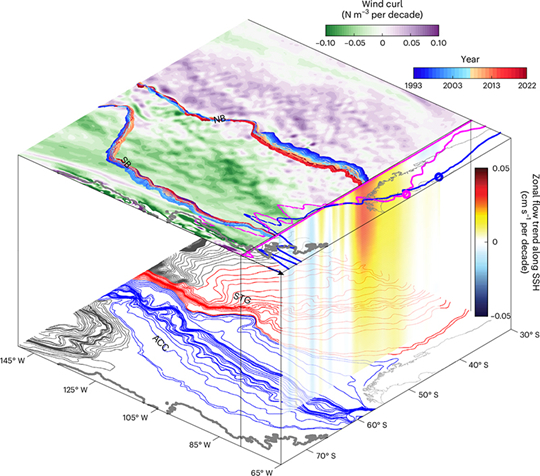 Drake Passage maintains a stable circumpolar transport”(德雷克海峽上游南極繞極流南移維持其環(huán)南極流量穩(wěn)定)的最新研究成果。該研究揭示,在最近30年全球變暖背景下,南大洋雖然因南北增暖不均造成其北部的緯向流加速,但是南極繞極流的北邊界也發(fā)生了南移,使得增強的流動被分流至亞熱帶的南大洋超級環(huán)流,從而維持了南極繞極流在其整個流域中的流量穩(wěn)定。