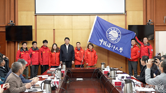 會(huì)議同時(shí)舉行了中國(guó)第42次南極考察中國(guó)海洋大學(xué)隊(duì)員出征授旗儀式。王厚杰向此次代表學(xué)校出征南極的海洋與大氣學(xué)院、物理海洋教育部重點(diǎn)實(shí)驗(yàn)室、海洋生命學(xué)院、水產(chǎn)學(xué)院的師生授旗,并期盼隊(duì)員牢記使命、勇?lián)厝巍F(tuán)結(jié)協(xié)作、聚力攻堅(jiān)、確保安全。出征隊(duì)員代表、海洋與大氣學(xué)院孫永明老師在發(fā)言中表達(dá)了作為海大人參與極地考察的榮幸、激動(dòng)與期待,各位隊(duì)員將秉承海大校訓(xùn)精神,嚴(yán)謹(jǐn)求實(shí),勇于探索,圓滿完成科考任務(wù)。