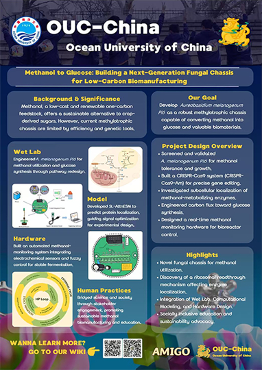 OUC-China團(tuán)隊(duì)今年以AMIGO(Aureobasidium Methanol Into Glucose Output)為題,聚焦氣候問題背景下的“雙碳”問題,重點(diǎn)探索一碳化合物甲醇向高附加值葡萄糖轉(zhuǎn)化的技術(shù)突破。項(xiàng)目以多極端耐受海洋酵母Aureobasidium melanogenum為研究對(duì)象,建立CRISPR-Cas9基因編輯系統(tǒng),闡明其甲醇代謝機(jī)制,通過重構(gòu)關(guān)鍵代謝途徑,構(gòu)建出可從甲醇合成葡萄糖的工程菌株。為優(yōu)化發(fā)酵過程,團(tuán)隊(duì)基于氣液交換模型開發(fā)實(shí)時(shí)甲醇監(jiān)測(cè)與自動(dòng)進(jìn)料裝置,實(shí)現(xiàn)甲醇濃度的便捷精準(zhǔn)測(cè)量。以上工作為利用該海洋酵母真菌進(jìn)行一碳化合物生物轉(zhuǎn)化制備化學(xué)品奠定基礎(chǔ),彰顯其在可持續(xù)碳利用中的潛力。
