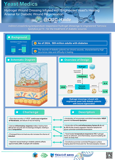 OUC-Haide團(tuán)隊(duì)今年重點(diǎn)關(guān)注糖尿病患者慢性難愈傷口再生的治療挑戰(zhàn)。團(tuán)隊(duì)推出“Yeast Medics”項(xiàng)目——一種基于工程化解脂耶氏酵母與L-多巴修飾溫敏殼聚糖的創(chuàng)新可注射敷料。該系統(tǒng)可動(dòng)態(tài)感知傷口狀態(tài),在酵母表面展示抗菌肽,并程序化釋放抗炎因子(IL-4)與促血管生成因子(VEGF),在單一平臺(tái)上協(xié)同解決感染、炎癥、再生三大核心難題,為糖尿病患者提供一體化、自驅(qū)動(dòng)、低負(fù)擔(dān)的愈合方案。