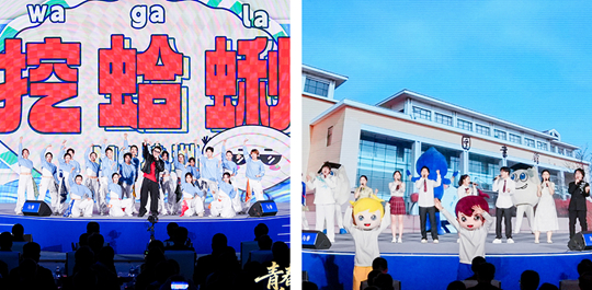 沙洲(左)演唱《挖蛤蜊》,海大學(xué)子代表演繹《愛如海大》