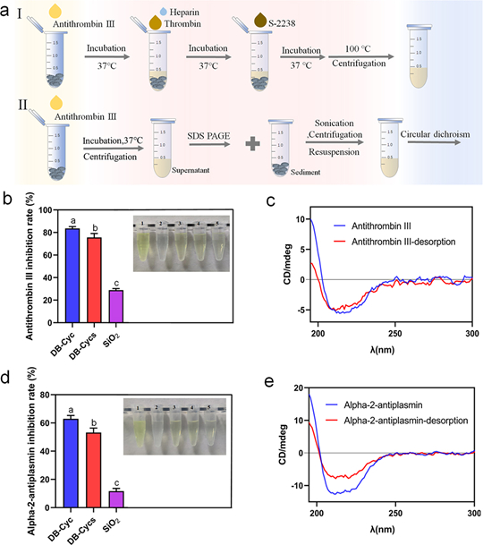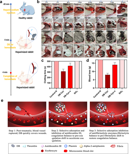 該研究系統(tǒng)揭示了DBs與血液接觸后其表面吸附蛋白的演變進程,發(fā)現(xiàn)DBs對凝血因子的選擇性吸附行為和專一性抑制作用是引發(fā)促凝血反應的關鍵作用機制。基于實驗驗證和分子模擬結果,發(fā)現(xiàn)DBs通過其微納米層級多孔結構所帶來的尺寸篩分效應,實現(xiàn)對抗凝血酶III和α-2抗纖溶酶的高效富集和定向抑制,使血液系統(tǒng)處于高凝狀態(tài);其表面硅醇基團可以激活內(nèi)源性凝血途徑相關因子,包括凝血因子V、IX、X、XI和 XII,從而促進凝血反應發(fā)生。隨后,通過將肝素引入全血中以增強抗凝血酶III活力,證實了DBs的結構界面效應對抗凝血酶III活性的高效抑制作用。最后,建立了血液肝素化的大鼠斷尾模型和兔股靜脈穿刺模型,從動物水平上進一步評估了DBs在出血性疾病治療方面的應用潛力。該工作系統(tǒng)的解析了DBs促凝血活性的分子機制,同時也為無機多孔材料的生物活性調控以及新型止血材料的設計提供了新思路。