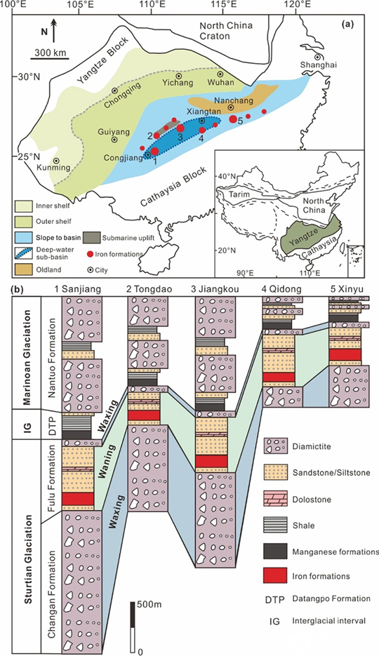 圖1 華南板塊Sturtian 冰消期IFs的古地理背景與區(qū)域地層對比圖