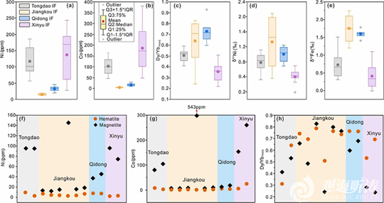 圖4 華南板塊Sturtian 冰消期IFs中共生赤鐵礦和磁鐵礦金屬元素、稀土元素與釔(REY)及同位素組成的分布特征與礦物特異性差異