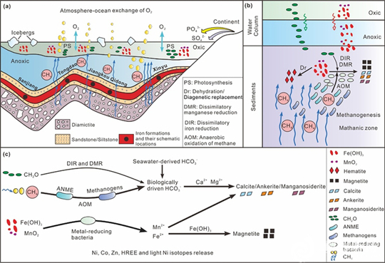 (2)相較于硫酸鹽驅(qū)動的AOM,金屬驅(qū)動AOM的氧化效率更低,因此更可能允許大量CH4逃逸入大氣。南華盆地IFs中赤鐵礦與磁鐵礦普遍共存現(xiàn)象亦支持了該推測。