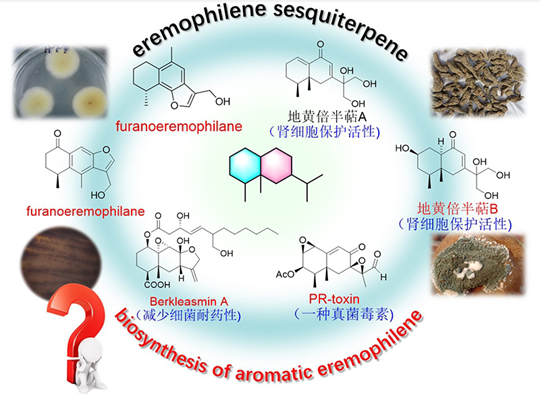 芳構(gòu)化是天然產(chǎn)物生物合成中一個(gè)至關(guān)重要的過(guò)程,賦予分子獨(dú)特的化學(xué)穩(wěn)定性和生物活性。在萜類化合物中,芳構(gòu)化通常涉及復(fù)雜的骨架重排,其背后的酶促機(jī)制非常獨(dú)特且鮮有研究。艾里莫酚烷(eremophilanes)是一類結(jié)構(gòu)多樣、生物活性顯著的重要倍半萜類天然產(chǎn)物,具有良好的藥用開(kāi)發(fā)潛力。從生物合成路徑來(lái)看,所有eremophilanes均起源于馬兜鈴烯骨架,由法尼基二磷酸(FPP)在馬兜鈴烯合酶(AS)催化下通過(guò)環(huán)化反應(yīng)生成。不同于傳統(tǒng)倍半萜類化合物,eremophilanes家族中多個(gè)成員含有芳香結(jié)構(gòu),其形成涉及多異戊二烯骨架的斷裂與重排,但具體機(jī)制尚未被研究報(bào)道(圖1)。