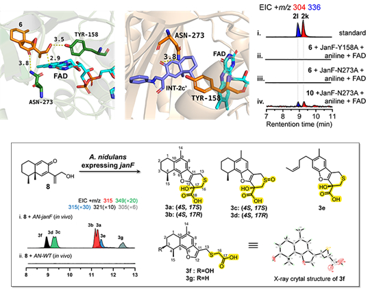 研究團(tuán)隊(duì)首先從一株海洋淡紫青霉Penicillium janthinellum H7-4中發(fā)掘出一個(gè)沉默的倍半萜類生物合成基因簇(jan cluster),并通過(guò)在野生菌株中過(guò)量表達(dá)該基因簇中的途徑特異性轉(zhuǎn)錄因子JanG,成功激活了該基因簇,獲得了具有芳香結(jié)構(gòu)的eremophilanes類倍半萜衍生物farfugin A。為進(jìn)一步解析其生物合成潛力,研究團(tuán)隊(duì)將janA-F功能基因在模式菌株Aspergillus nidulans A1145中逐步異源表達(dá),成功獲得了包括farfugin A和一類新穎的由eremophilane骨架與L-蘇氨酸雜合而成的芳香倍半萜-氨基酸加合物aza-janthinellin A。后續(xù)生物合成機(jī)制研究進(jìn)一步揭示,在farfugin A與aza-janthinellin A的合成過(guò)程中均存在由(氧或氮原子)親核加成引發(fā)、并伴隨[1,2]-烷基遷移的環(huán)重排機(jī)制,最終完成芳香化的過(guò)程。尤其在aza-janthinellin A形成過(guò)程中,一個(gè)FAD依賴型單加氧酶JanF被證實(shí)能夠催化氧化烯丙醇從而生成,具有高反應(yīng)活性的α,β-不飽和醛中間體,進(jìn)而接受伯胺類試劑的親核攻擊,以此引發(fā)骨架的烷基化遷移和芳香化重排。研究還發(fā)現(xiàn)JanF可通過(guò)其活性口袋中的Asn273殘基穩(wěn)定C8-羰基,選擇性地引導(dǎo)α,β-不飽和酮發(fā)生1,2-加成而非1,4-加成,這一過(guò)程是構(gòu)建芳香骨架的關(guān)鍵步驟(圖2)。在此基礎(chǔ)上利用JanF強(qiáng)大的催化功能,多種伯胺試劑與具有α,β-不飽和醇的eremophilane底物進(jìn)行孵育,可以獲得結(jié)構(gòu)多樣、活性良好的一系列氨基酸-eremophilane加合產(chǎn)物。