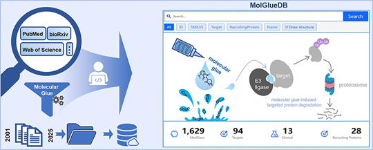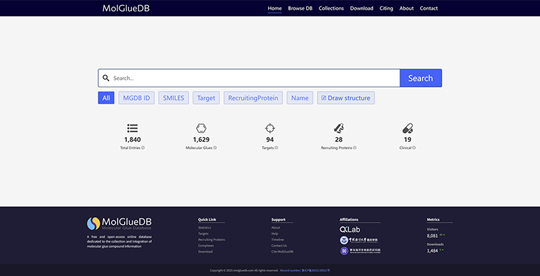 在藥物發(fā)現(xiàn)領(lǐng)域,分子膠降解劑(Molecular Glue Degraders, MGD)作為一種新興的靶向蛋白降解技術(shù),正日益受到科研和制藥行業(yè)的關(guān)注。近年來已有20余個分子膠進入臨床試驗,展現(xiàn)出巨大應(yīng)用潛力。然而,分子膠降解劑的發(fā)現(xiàn)與理性設(shè)計面臨巨大挑戰(zhàn)。為推動MGD的合理設(shè)計與開發(fā),研究團隊構(gòu)建并上線了MolGlueDB,這是一個開放訪問的網(wǎng)絡(luò)數(shù)據(jù)庫,旨在為全球研究者提供全面、可靠的MGD資源。該數(shù)據(jù)庫于2025年初正式上線,可通過鏈接https://www.molgluedb.com/免費訪問,訪問量已累計超過8000次,數(shù)據(jù)下載與導(dǎo)出次數(shù)達1400余次,充分表明該平臺已在學(xué)術(shù)界和產(chǎn)業(yè)界獲得積極關(guān)注,成為分子膠研究的重要工具。
