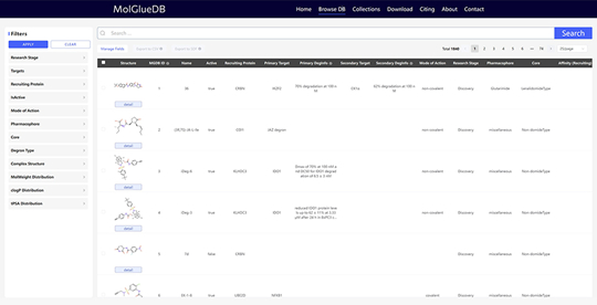 數(shù)據(jù)庫的功能模塊設(shè)計合理,支持多種檢索方式。用戶可以通過文本搜索快速查找特定MGD、靶點或E3蛋白;結(jié)構(gòu)檢索功能則包括子結(jié)構(gòu)搜索和相似性搜索,配備在線分子編輯器,便于用戶繪制或修改分子結(jié)構(gòu)進行查詢。多維度篩選工具允許根據(jù)靶點、E3招募蛋白、理化性質(zhì)或藥效團類型過濾數(shù)據(jù),幫助研究者高效定位潛在候選物。在人工智能驅(qū)動的藥物設(shè)計中,這些功能可支持機器學(xué)習(xí)模型的訓(xùn)練和虛擬篩選,加速新型MGD的發(fā)現(xiàn)。