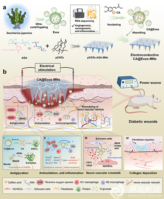 研究團隊構建了一種新型生物-電療法平臺,通過將咖啡酸工程化的海帶(Saccharina japonica)外泌體(CA@Exos)物理吸附到導電瓊脂糖微針針尖中,利用CA@Exos產(chǎn)生的生物信號與導電微針傳遞的電信號協(xié)同作用,重塑糖尿病創(chuàng)面的神經(jīng)-血管微環(huán)境。應用于糖尿病傷口后,CA@Exos能抑制AGEs生成、清除活性氧并改善炎癥,同時激活血管生成和神經(jīng)再生信號通路,增強雪旺細胞與血管內皮細胞間的串擾。導電微針不僅實現(xiàn)了外泌體的皮膚深層組織遞送,還作為時空可控的生物電支架,通過傳遞電刺激信號以促進外泌體攝取并放大內源性傷口電流。該雙模式策略協(xié)同加速血管新生、神經(jīng)再生與再上皮化,從而加速糖尿病大鼠全層創(chuàng)面愈合。研究團隊將海洋生物來源的外泌體與導電微針有機結合,不僅拓展了海洋活性物質在再生醫(yī)學中的應用,也展示了生物信號與物理刺激信號協(xié)同調控微環(huán)境的新思路,為臨床解決糖尿病慢性創(chuàng)面這一重大難題提供了潛在的轉化應用方案。
