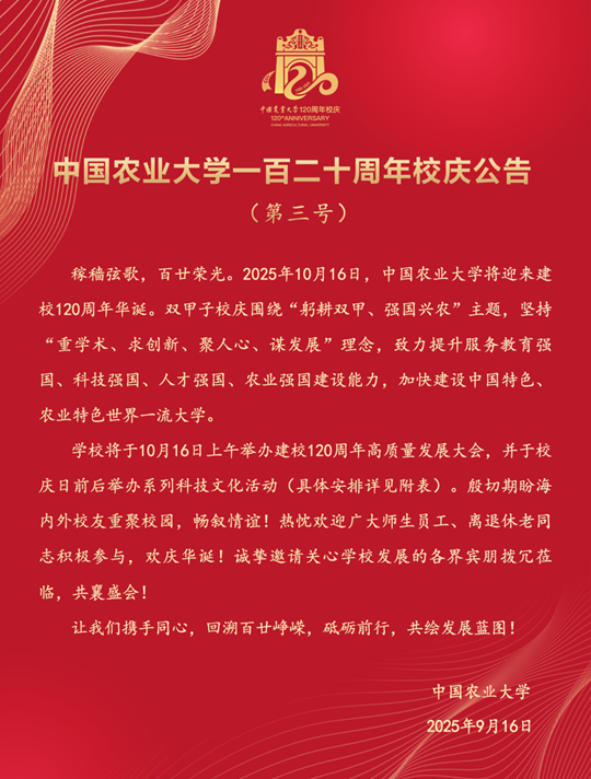 中國農(nóng)業(yè)大學(xué)一百二十周年校慶公告(第三號(hào))