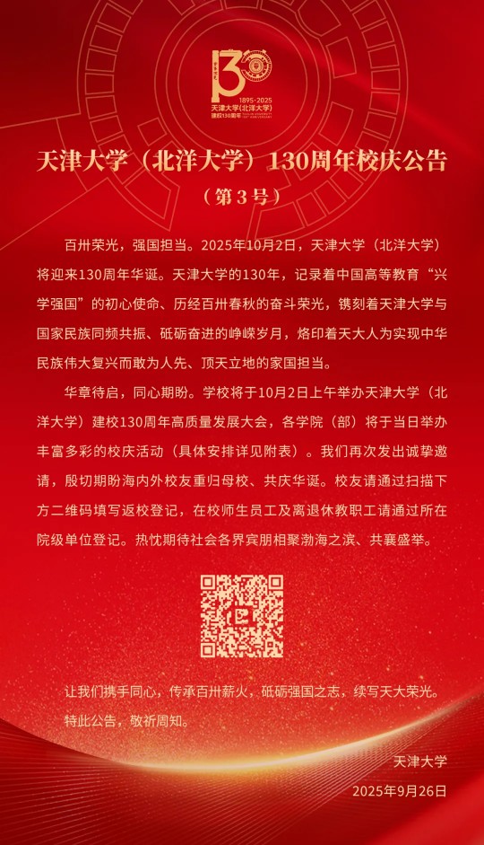 天津大學(xué)(北洋大學(xué))130周年校慶公告(第3號(hào))