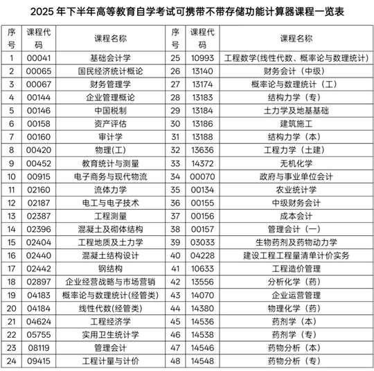 考生可攜帶不帶存儲功能的計算器參加部分課程考試,詳情見下表。