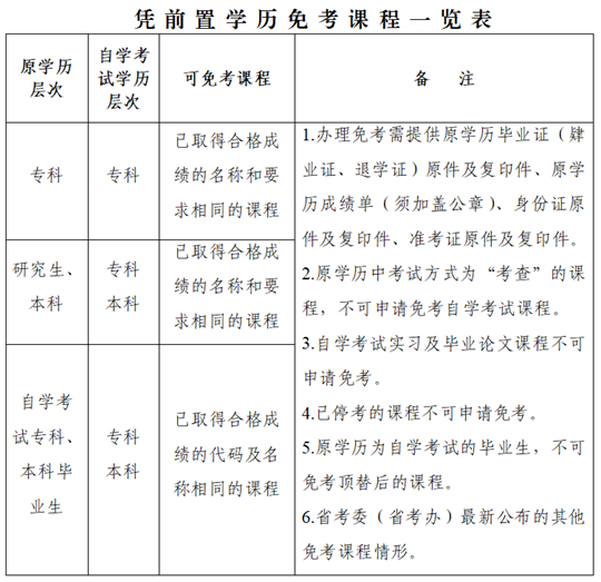 國(guó)家承認(rèn)學(xué)歷的各類(lèi)高等學(xué)校及自學(xué)考試專(zhuān)科以上(含專(zhuān)科)的畢業(yè)生(肄業(yè)生、退學(xué)生)報(bào)考自學(xué)考試,可按有關(guān)規(guī)定申請(qǐng)免考已學(xué)過(guò)并考試成績(jī)合格的有關(guān)課程。本科結(jié)業(yè)可視同專(zhuān)科學(xué)歷,可使用結(jié)業(yè)的合格成績(jī)辦理專(zhuān)科層次課程的免考。