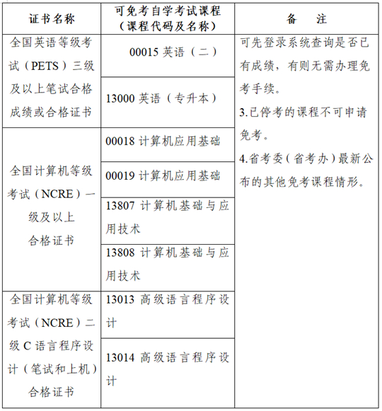 根據(jù)有關(guān)規(guī)定,目前可申請(qǐng)免考自學(xué)考試課程的證書(shū)包括學(xué)歷證書(shū)和全國(guó)計(jì)算機(jī)等級(jí)考試(NCRE)、全國(guó)英語(yǔ)等級(jí)考試(PETS)、大學(xué)英語(yǔ)四六級(jí)考試(CET)的相關(guān)等級(jí)證書(shū)。